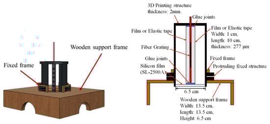 In addition, the 3D printing time of the film squeeze structure is longer and, during the measurement process, the sensing height must be fixed by hand-holding or using the object to stand up to cause the structure deformation or to create additional protruding blocks. For solving the problem, the support frame is designed to stabilize the overall structure for measuring the vibration signals according to the appropriate fixed height. The 3D view and cross-section of the new film squeeze structure are shown in Figure 2.