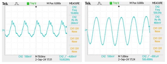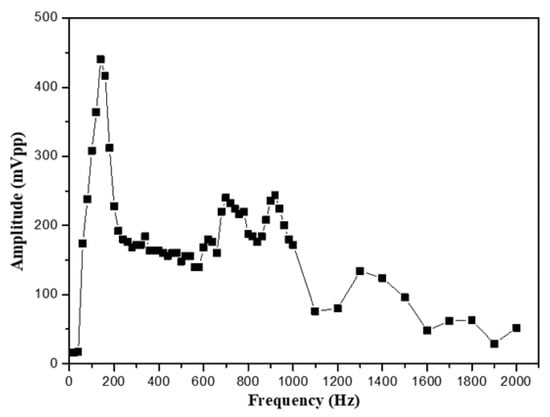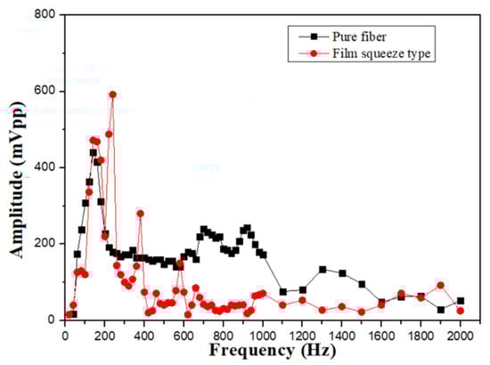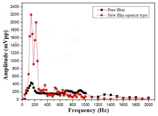 For comparing the experimental results in different sensing structures, the film squeeze type is used for detecting vibration signals in the mid–high frequency range from 260 to 1000 Hz and in the mid–low frequency range from 100 to 150 Hz. Because the vibration amplitude of the bottom film is too large, the irregular oscillation makes the waveform distortion as shown in Figure 7a. In the intermediate frequency band, although the amplitude is not enough large, the waveform can be measured stably as shown in Figure 7b,c. For the signals above 2000 Hz, it is difficult to measure, due to the small vibration amplitude and the soft absorption characteristics of the film. The overall signal measurement with its frequency response spectrum is shown in Figure 8.