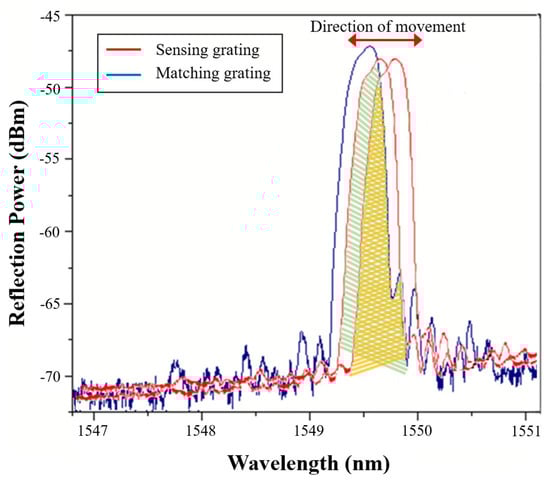 The overlapping reflection spectra between the sensing grating and the matched grating.