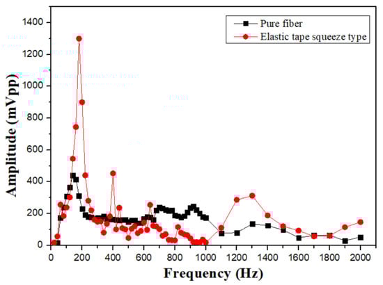 The elastic-tape squeeze type shows its material properties for the frequency range from 100 to 200 Hz, and has a high signal amplification effect, but also due to the excessive deformation of the fiber grating, the waveform distortion is shown in Figure 9a,b. However, the characteristic of this structure is that it has a significant sensing effect in the high-frequency range from 1100 to 2500 Hz. The main reason is that the stretching effect of the elastic tape is better, and it is not easy to absorb the signal amplitude, so that it can measure up to about 3100 Hz. The sensor with better performance in the mid- and high-frequency response is shown in Figure 9c,d. We can also observe that in comparison with unstructured fiber grating, the high-frequency response is nice than that of a pure grating as shown in Figure 10. The sensor with the best high-frequency response in the experiment is an elastic tape squeeze structure.