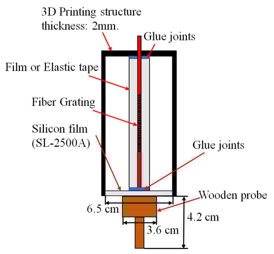 For improving the low-frequency sensing performance, a probe is installed at the bottom of the elastic tape squeeze sensor, as shown in Figure 11, by directly contacting the vibration source created by the speaker. The purpose of the probe structure design is to obtain a better response in the lower-frequency band by utilizing the probe tip to directly contact the vibration film of speaker to directly conduct the speaker vibration signal to drive the silicon thin-film. The purpose of this design is to compare the sensing characteristics between the non-contact type and contact type fiber-grating vibration sensors. The probe is wooden material with a length of 3.6 cm, a width of 3.6 cm, and a height of 4.2 cm. This design is attributed to the fact that the sensing thin-film of the sensor can directly detect the larger vibration signals in the lower frequency band created from the speaker. It is confirmed by the experimental results, as shown in Figure 12, which show the capability to detect the 10 Hz signal. Due to the small vibration amplitude in the middle- and high-frequency bands, the sensing performance will be decayed by using the probe contact method.
