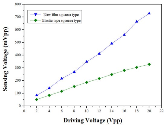 However, in order to clearly understand the sensing sensitivity of each sensor, a sine wave from the signal generator with a frequency of 300 Hz is amplified and adjusted to be the output voltage range from 2 Vpp to 20 Vpp per 2 Vpp to drive the speaker. The output signals of the photodetector detecting from the sensing-head optical signals are monitored for obtaining the relationship between the output and input amplitudes, as shown in Figure 15. From the figure, we can see that the measurement curves between the output and the input voltages for the sensors are almost linear. The sensitivity of each sensor is the curve slope, which can also be linearly fitted from each line segment in the figure. From the curves, a sensitivity of 35 mV/V, which can be converted to 0.302 mV/g according to the speaker specifications, the driving speaker voltages, and detecting signals, etc. The new film squeeze type at 300 Hz is obtained and the sensitivity of the elastic tape squeeze type is 15 mV/V, which can be converted to 0.129 mV/g according to the speaker specifications, the driving speaker voltages, and detecting signals, etc., at 300 Hz. Thus, the sensitivity of the new film squeeze structure in the intermediate frequency is higher than that of other types of sensors.