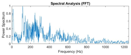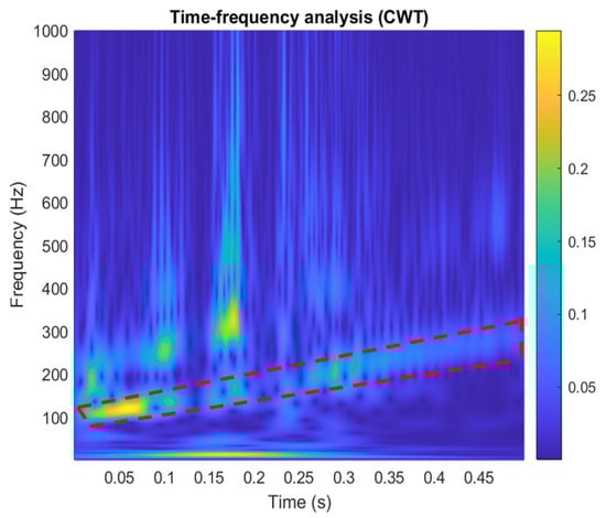 where ψ(t) is a continuous function in both time domain and frequency domain called the mother wavelet and the over-line represents operation of complex conjugate. a is the scaling parameter, b is the translation parameter, and the factor (1/√a) is used to normalize the energy of the CWT. The main purpose of the mother wavelet is to provide a source function to generate the daughter wavelets, which are simply the translated and scaled versions of the mother wavelet. Since it introduces a special window function for calculation, the low-frequency component is calculated with long-term series and narrow bandwidth and the high-frequency component is calculated with a short time series and a wide bandwidth to obtain the timing of the frequency to be reflected in the time series of the signal, as shown in Figure 16, in which the time-domain signal is measured by a new film squeeze sensor. By using the fast Fourier transform analysis, the vibration signal has frequency changes from 100 Hz to 300 Hz within 0.5 s, as shown in Figure 17, in which the peak of around 150 Hz can be used for confirming to match the peak of frequency response in Figure 13. From the comparison between Figure 13 and Figure 17, we can see that the frequency response of the sensor is mainly focused on the frequency range from 100 Hz to 300 Hz, but the frequency response obtained by using the FFT has a large amount of noise. It shows the sensing signals in components of 100~300 Hz. Figure 18 is a wavelet analysis diagram in which the color contrast is used to distinguish different time points and the amplitude of the components that appear at each frequency. The marked-red region shows that, within the time variation, the appearance time of frequency components from 100 Hz to 300 Hz extends from the bottom left to the top right. It can be known that the vibration signals whose frequency changes with time rather than a mixing signal can reduce the misjudgment of the spectrum.