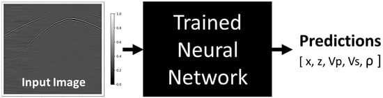 In this article, we investigate an approach based on a supervised deep-learning convolutional neural network and extend it to detect and locate passive seismic sources automatically [20,21]. After a neural network is trained, images of pre-processed field data can be fed into the neural network to output predictions of event depth and offset (z, x) and subsurface properties, including estimates of P-wave and S-wave velocities (Vp, Vs) and density (ρ) at the event location, as shown in Figure 1. These estimates can then be used to reconstruct property logs for all depths, given a sufficient number of detected events.
