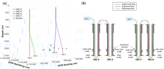 A seismic dataset from the Otway Stage 3 CO2 injection monitoring project, located on the southern shores of the Australian state of Victoria, is used to demonstrate and test the methodology at a reasonable scale. Multiple wells instrumented with DAS were used to continuously record passive seismic data before and during the injection of CO2 into a reservoir at around 1550 m depth. Hundreds of terabytes of data were recorded from multiple wells and scanned to detect and locate induced events. The detection was done in two stages, first by using the ratio of short-time to long-time averages (STA/LTA), then with a semblance-based method using waveform cross-correlations to narrow the search. To locate the detected events, travel-time curves of P- and S-waves were analyzed first. The depths of hypocenters were estimated based on the P-wave mean apex depth, which was then used in a grid search to estimate the lateral locations based on time delays between P- and S-waves. Reasonable lateral uncertainty was demonstrated in the direction between the two well groups. Event magnitudes were also estimated [23]. Thus, the detected induced event locations are used as a reasonable ground truth to validate predictions. Specifically, we rely on DAS data from four wells (CRC-3, CRC-4, CRC-6, and CRC-7) with depths of around 1650 m, as shown in Figure 2a. The wells are slightly deviated, except for the CRC-3 well. Simplified schematics of fiber-optic installations in the four wells are shown in Figure 2b.