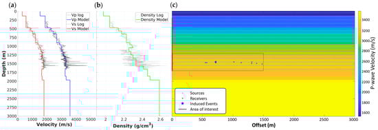 Upscaled 1D model of (a) P-wave and S-wave velocity and (b) density from vertical CRC-3 well. (c) An extended 2D model over 3000 m of offset with an overlay of source and receiver locations used for modelling, focusing on an area of interest around the induced event locations.