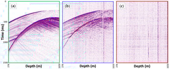 A sample synthetic record 1.5 s long was used as a point source at a depth of 1450 m and an offset of 720 m, shown in Figure 4a. An equivalent field data seismogram of a strong induced event, recorded using DAS and covering a similar depth range, is shown in Figure 4b for comparison. The induced event has an estimated source depth of 1470 m and an offset of 720 m from the CRC-3 well. The synthetic and field data seismograms in Figure 4a,b were aligned, their geometries were matched, and a bandpass filter (6.5–13–120–170 Hz) was applied to all three records for easier comparison.