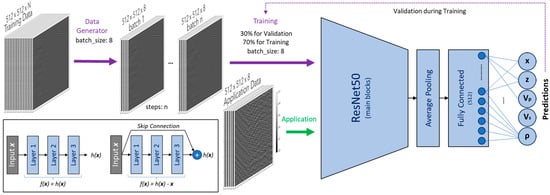 Moreover, the weights of a regular neural network are close to zero at the initialization stage, so the network only outputs values close to zero, while with a skip connection, the resulting network outputs a copy of its inputs; that is, it initially models the identity function. This is particularly useful because it speeds up the training considerably, as the target function is often close to the identity function. The neural network is set up to input 512 × 512 pixels (1 channel) images, and a few more average pooling and fully connected layers were added at the end, as shown in Figure 5. The resulting network has 24,633,093 parameters, out of which 24,579,973 are trainable.