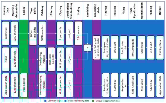 Training and application data preparation workflow highlighting common steps in blue, steps unique to training data in purple, and steps unique to application data in green.