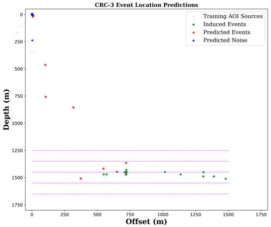 Predictions were performed on CPU and took 29.8 s to complete. Figure 8 shows a depth-offset plot of location predictions for data from the CRC-3 well. The green stars represent the actual locations of induced events relative to the vertical well positioned at zero offsets.