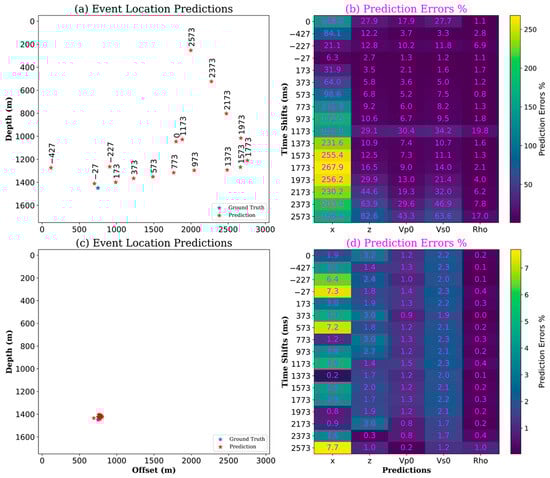 The same test was repeated with a second event shifted by multiples of 200 milliseconds. This dataset was then used for event location prediction using a second trained model that included time shifts in the training data, as shown in Figure 9c. Subsequently, prediction errors were calculated and shown in Figure 9d. The first model shows that the neural network is sensitive to time shifts in the input images, resulting in larger prediction errors as time shifts increase.