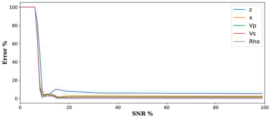 An inherent limitation of convolutional neural networks is their lower performance at low SNR values [29]. We tested this for the ResNet50 architecture by generating 100 patches combining a single synthetic event with the same noise record. A scalar multiplier varied the signal level between 0 and 1. These patches were then fed into the trained neural network for predictions. As known labels were also generated for this small dataset, errors were calculated for each of the predictions, as shown in Figure 10. For SNR values less than nine percent, predictions have huge errors and stabilize above that. The ResNet50 architecture performance was the worst compared to other network architectures, which led to the consideration of other architectures, such as AlexNet, to improve the detectability of induced events of low SNR values. This led us to another consideration of including denoising as part of our implementation, particularly in the data preparation workflow [30,31].
