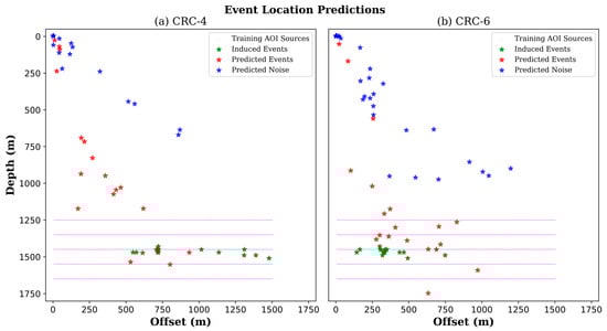 Predictions of event and noise locations for data from slightly deviated (a) CRC-4 and (b) CRC-6 wells. Green stars represent the actual locations of induced events relative to the well positioned at zero offset.