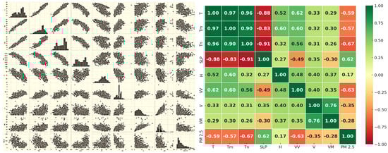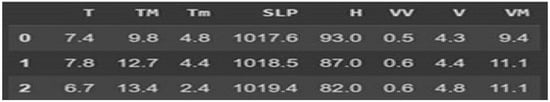 The regression model under the multimodal process is constructed as illustrated in Algorithm 4. The preprocessing starts with combining the data from multiple CSV files into a unified data frame, as displayed in Figure 6. The meteorological variables explored are shown in Table 3. Then, it thoroughly explores the dataset using visualization, including a pair plot to show the relationships between the variables and a correlation heatmap plot to show how the features are related to each other or the target variable, as illustrated in Figure 7. The features of visibility, temperature and pressure exhibit the strongest correlations with the AQI. Furthermore, the visibility is internally dependent on the wind velocity.