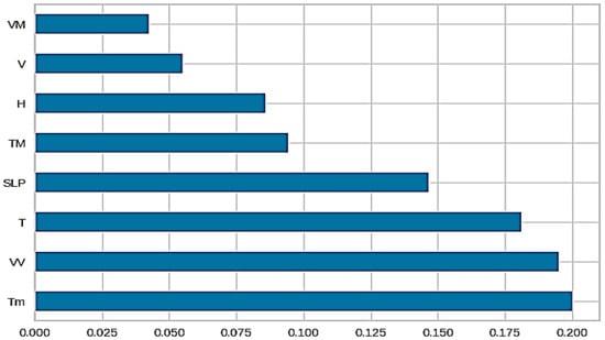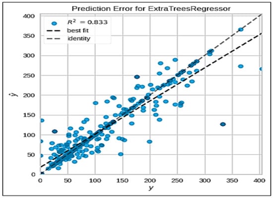 Based on the previous comparisons, the best model is created. In this case, it specifies the extra trees model (‘et’) as the best model. Then, a plot is generated illustrating the feature importance for the best model, as visualized in Figure 13. This helps us to understand which features contribute the most to the model’s predictions. The best model is further tuned using the tune_model function, as shown in Table 8. It performs hyperparameter tuning to optimize the model’s performance. It is found that the root mean squared error is the metric to optimize. The training data are divided into 10 folds. In each iteration of the training process, the model is trained on nine of these folds and tested on the remaining fold. This process is repeated 10 times, each time using a different fold as the test set. The hyperparameter tuning process involves exploring a set of 10 different combinations of hyperparameter values. Since there are 10 folds for each of the 10 candidates, the total number of model fits or training cycles is 100 (10 folds × 10 candidates).