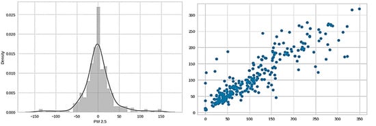 The model with the best hyperparameters is used to obtain predictions on the test set. A distribution plot and a scatter plot are created to visualize the differences between the actual and predicted values, as illustrated in Figure 9. The mean absolute error (MAE), mean squared error (MSE) and root mean squared error (RMSE) are calculated as additional evaluation metrics, with the values being 22.50, 1274.62 and 35.70, respectively. The training, evaluation, hyperparameter tuning and serialization of a random forest regressor model are successfully executed.