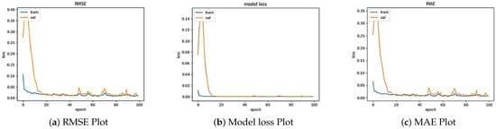 The results obtained from the ConvLSTM modeling indicate strong performance in handling image sequences, with the performance metrics showing a test RMSE of 3.7870, a test loss of 14.3415 and a test MAE of 0.2858, reflecting the model’s efficiency in accurately predicting the outcomes. The visualization of the RMSE, model loss and MAE across the training epochs is shown in Figure 10. The use of Equations (2) and (4) reveals a consistent decrease in loss for both the training and validation sets, suggesting the model’s ability to effectively learn from the data and generalize to unseen instances. This highlights ConvLSTM’s suitability for the modeling of temporal dependencies inherent in image sequences, making it a powerful tool for tasks involving spatiotemporal relationships. The findings also indicate that the further tuning of the model could enhance its performance, encouraging the exploration of larger datasets and alternative architectures. Additionally, benchmarking ConvLSTM against other state-of-the-art models could provide insights into its relative strengths and weaknesses, ultimately affirming its potential applications in fields like meteorology and environmental monitoring.