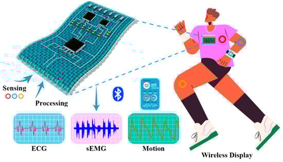 Smart clothing is an integration of textile materials and electronic information technology that can detect changes in the external environment or internal state and provide real-time feedback or interactions [,,]. Sensors of smart clothing have gained a lot of attention because they are flexible, lightweight, and better wrap around the body to provide real-time and non-invasive health monitoring, including monitoring electrophysiology, chemical composition, and exercise motions [,,]. As a matter of fact, it is a challenge to achieve truly unobtrusive monitoring []. Although the sensing unit was designed to be flexible and miniaturized, it still requires a large peripheral volume of signal computing equipment to process sensed signals, such as Arduino hardware [] to produce electrocardiographs [,,]. Additionally, standard PCB preparation equipment is expensive, and the process involves corrosive chemicals and other forms of environmentally damaging products [,]. The creation of integrated flexible electronics for information sensing, storage, and processing in wearable health monitoring devices is a critical issue.