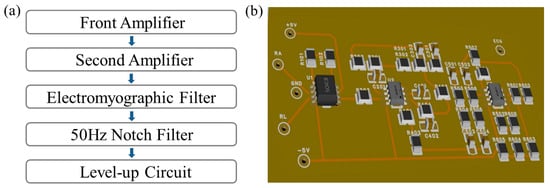As shown in Figure 2, the biopotential amplifier circuit was eventually designed to comprise five modules including a front amplifier, second amplifier, electromyographic filter, 50 Hz notch filter, and level-up circuit []. It is expected to achieve 1600 times the signal amplification while also effectively addressing the 50 Hz interference, baseline drift, muscle shaking, and other interference issues in the process of electrophysiological signal acquisition and processing, making it suitable for the real-time monitoring of signals such as ECG, EMG, and joint movements.