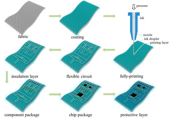 Although the above strategies solved the issue of flexibilization in core arithmetic circuits, the issue still persists in external devices for smart clothing. To solve the issue in daily, wearable clothing, a series of attempts have been made by researchers to create flexible, fabric-based hybrid electronics. Zhuang et al. [] utilized three-dimensional patterned technology to fabricate multilayered liquid metal circuits, combining high-density inorganic electronic components and organic stretchable fibrous substrates to create wireless, battery-powered, and battery-free bio-electronic systems attached to the skin. The approach is mostly used for stretching electronic skin, and it is complicated and expensive in terms of materials, equipment, and processes. Ma et al. [] employed a practical chemical process of polymer-assisted metal deposition (PAMD) to achieved fabric surface circuit metallization and developed fabric-based wireless epidermal biosensing. However, this was not applicable to the creation of intricate, multilayer, non-crossing circuits, such as those with a through-hole, via-hole, and insulation between signal and ground layers.