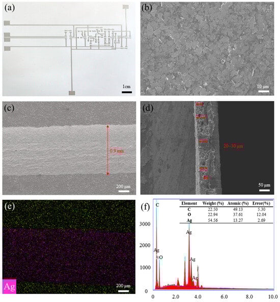 The surface and cross-section morphology of the printing circuit: (a) the overall shape; (b) the surface morphology with a magnification of 1000 times; (c) the width of the conductive line is about 0.9 mm with 50 times magnification; (d) the thickness of the conductive line is about 20~30 μm (red arrow area) with a cross-sectional magnification of 200 times; (e) element mapping; (f) the EDS spectra.