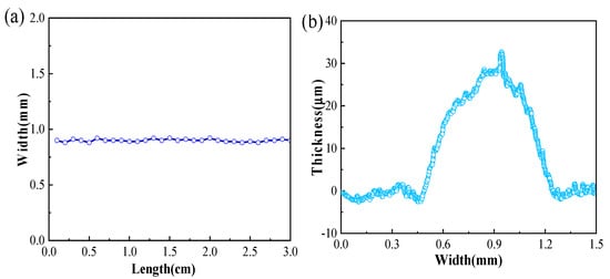 As shown in Figure 5a, the width and inhomogeneity of the printing layers were measured by an optical microscopy, and the average width is 0.90 ± 0.10 mm, which is consistent with the surface morphology by SEM (shown in Figure 4c). On the other hand, the thickness of the printed conductive layers was measured by the level meter (KLA, Alpha-Step D-300), and the result shows that the average thickness is 25.19 ± 8.76 nm (shown in Figure 5b) which is also consistent with the cross-sectional thickness measured by SEM (shown in Figure 4d). According to the scanning results of the step meter, the thickness of the printed film is thinner on both sides and thicker in the center, which is connected to the ink viscosity, printing process parameters, curing conditions, and other factors.