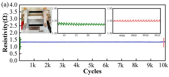 Resistance shift after 10,000 cycles of tensile and flexural conditions: (a) tensile test (the blue line means the resistance shift during 0 to 10,000 cycles of stretching; the green and red lines are localized zoomed-in plots, indicating the changes in resistance during the initial and final time periods, respectively); (b) bending test (the blue line means the resistance shift during 0 to 10,000 cycles of bending).