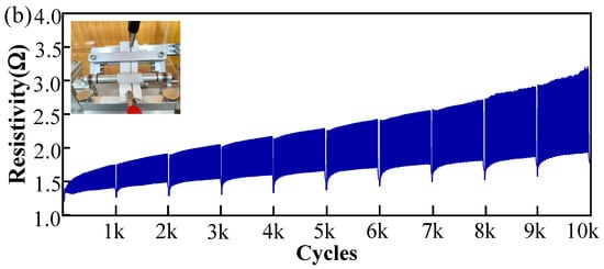 For the tensile test, the total length of the sample was set to be 5 cm, and the starting position of the stretching was 0 cm, while the ending position of the stretching was 5.1 cm. That is to say, the total stretching rate of the sample was controlled to be 2%. As displayed in Figure 6a, after 10,000 stretching cycles, the resistance of the sample remained mostly the same. Within the length of 6 cm, the total resistance rose slightly from 1.33 Ω to 1.35 Ω, and the average resistance remained at 0.27 Ω/cm after 10,000 cycles of stretching, indicating the exceptional electrical stability of the printed fabric-based circuits.
