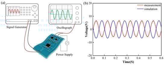 The functional verification of the printed fabric-based circuit: (a) schematic diagram of the measurement process; (b) comparison of the simulation and measurement results with a sine wave.