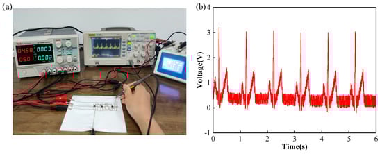 Furthermore, the conventional signal generator was replaced by the ECG simulator in order to verify its amplification of the ECG signal []. The experimental connection is shown in Figure 8a and the results are shown in Figure 8b. The ECG signal simulator (KS-300, Shanghai Pukang Co., LTD, Shanghai, China) was set at a normal sinus rhythm with a heart rate of 60 BPM and a signal amplitude of 1 mV. The results showed that the printed fabric-based hybrid circuit can effectively detect and amplify the ECG signals, which provided a solid foundation for detecting and amplifying real human electrophysiological signals.