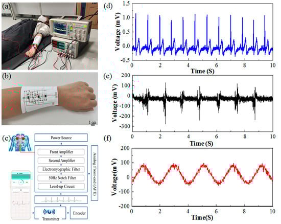 For a potential smart clothing or functional textile application, the capacity to monitor humans’ electrophysiological signals in real time is critical. Finally, a series of electrophysiological signals from the human body, such as ECG, EMG, and joint movement signals, were monitored by this printed fabric-based circuit. The physical diagram of the fabric-based hybrid electric circuit, the schematic diagram of signal monitoring, and the functional blocks of the designed circuits are shown in Figure 9a–c, while the experimental results are shown in Figure 9d–f.