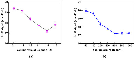 Since the PGM response comes from the signal value of Glu oxidation by GOx, it is necessary to optimize the ratio of C2 to GOx labeled on the surface of AuNPs. In theory, a high loading of GOx can enhance the sensitivity of the Cu2+ sensor. However, an excess of GOx molecules can affect the cycloaddition reaction between C1 and C2, which is unfavorable for a signal response. As shown in Figure 5a, the optimal volume ratio of C2 to GOx is 1:4 for the PGM response signal. Therefore, 400 μL of GOx (1 mg/mL) and 100 μL of C2 (5 μmol/L) were used to prepare AuNPs-GOx-C2.
