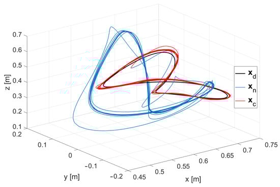 Figure 4 presents the results of implementing the method that utilizes Jacobian Weighting, compared against a traditional approach that does not incorporate the leaning concept. In this figure, the blue curves represent the traditional approach, the red curves depict the proposed method, and the black curves correspond to the trajectory defined by Equation (39). The results indicate that incorporating the leaning concept significantly improved the accuracy of the robot’s end effector. Additionally, Figure 5 provides a coordinate-wise comparison, showing that the largest error occurred along the z-axis. This error was notably reduced by employing the leaning technique, which leveraged the fixed surface to enhance overall precision. Figure 6 illustrates the comparison between the errors of the standard approach and our proposed method. As shown in the figure, our method significantly reduces the error.