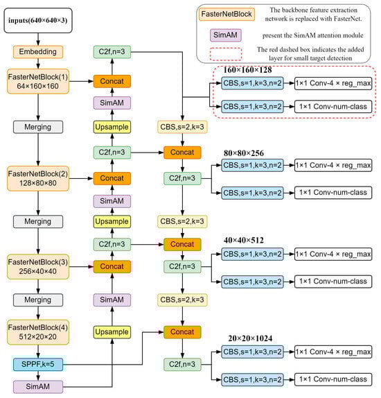 In this paper, the 80 × 80 feature map of the second layer of FasterNetBlock in the backbone network is combined with the feature layer of the Neck layer after upsampling. Through the C2f module and the upsampling step, a layer rich in small target feature information is formed. This layer is further combined with the 160 × 160 feature map output by FasterNetBlock, the first layer of the backbone network, in the channel dimension. This greatly strengthens the ability of the fusion feature map to capture small targets and the sensitivity of the network. Additionally, the C2f module outputs a detection head specifically tailored for small targets, further enhancing the positioning accuracy of the model.