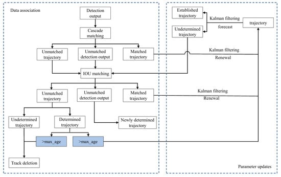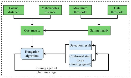 The DeepSORT (Deep Simple Online and Realtime Tracking) algorithm [25] is widely used in the field of multi-target tracking. It is an extension of the SORT (Simple Online and Realtime Tracking) [26] algorithm designed to enhance tracking performance by incorporating deep learning. DeepSORT effectively combines appearance and motion information to achieve real-time multi-target tracking. Specifically, it integrates a deep learning model into the SORT algorithm to extract target features, thereby improving the accuracy of target recognition and matching during the tracking process. The flow chart of the DeepSORT multi-target tracking algorithm is displayed in Figure 5.