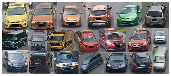 To enhance the ability to extract specific vehicle appearance features, one approach is to fine-tune the appearance feature extraction network to accommodate different vehicle sizes and train it on a vehicle re-recognition dataset. This will enhance the performance of the multi-target vehicle tracking model. The VeRi-776 dataset contains over 50,000 photos of 776 vehicles captured by 20 cameras covering an area of 1 square kilometer within 24 h. An example of the dataset is shown in Figure 8. This rich dataset is highly scalable and suitable for vehicle re-recognition research and related fields. The images are captured in real-world, unrestricted surveillance scenarios and include diverse vehicle attributes such as Bboxes, vehicle types, colors, and brands. Such comprehensive datasets provide a solid foundation for developing and evaluating complex vehicle re-recognition models. Each vehicle in the dataset is captured by 2 to 18 different cameras, encompassing multiple viewpoints, various light conditions, resolutions, and occlusions, making the dataset highly realistic for simulating vehicle re-recognition challenges in a real-world monitoring environment.