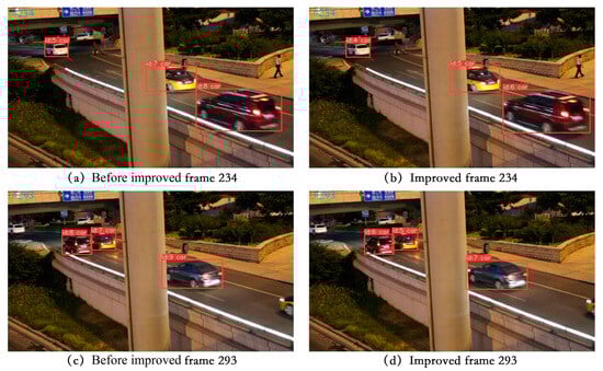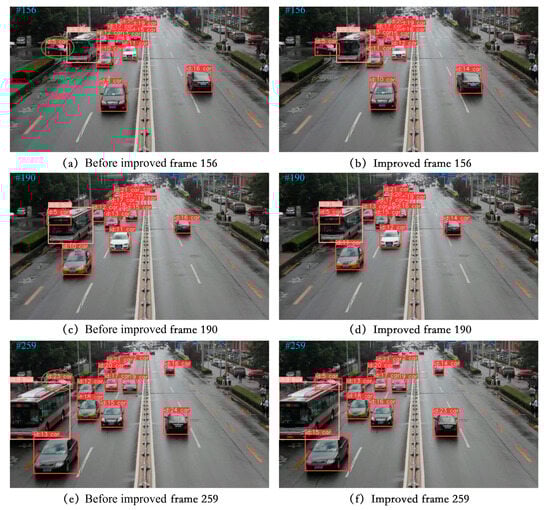 In Figure 14, the scene of video sequence MVI_40992 is a night scene with obvious occlusion. Vehicles are partially occluded when passing by. Despite the low traffic flow in the night scene, the video sequence was separately tested on the model before and after the improvement. The tracking effect shows no ID switch occurring before and after the occlusion.