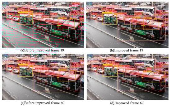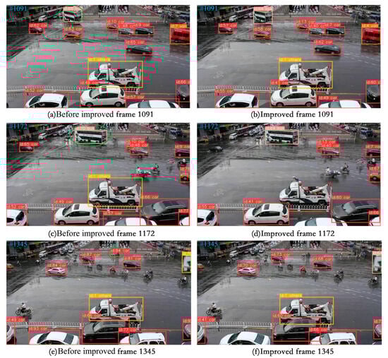 Figure 16 shows the rainy day video sequence MVI_40905 featuring a large number of small-sized vehicles with a complex overall background. The tracking performance before and after improvement is compared. Before the improvement, the model detected a bus with ID 68 in frame 1091. However, in frame 1172, the vehicle with ID 68 changed its identity without being obscured, indicating insufficient tracker stability. Additionally, before the improvement, the model mistakenly identified bicyclists and pedestrians as vehicles with id 94 until frame 1345. Conversely, after the improvement, the model showed relatively stable tracking without identity-switching issues and performed well in complex traffic scenarios.
