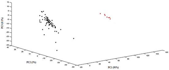 PCA plot obtained with the MIR spectra using the second derivative for menthol. Samples indicated with red stars are non-spiked samples, and samples indicated with black stars are spiked samples.