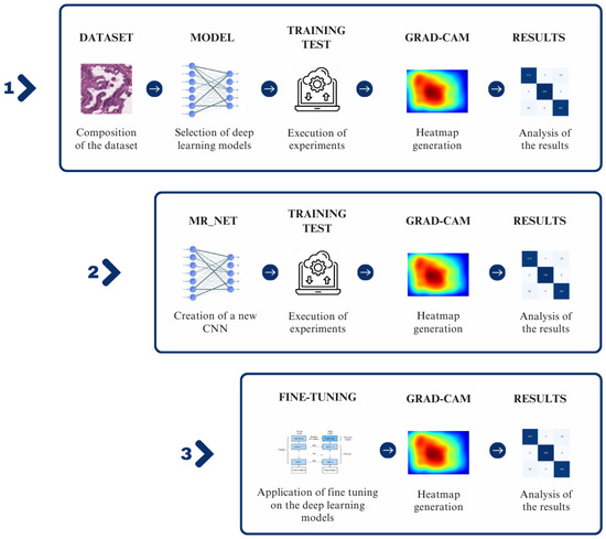 - The second phase (box 2 in Figure 1) involved the design of a new network architecture called MR_Net, execution of the experiments and generation of Grad-CAMs based on this model, and an analysis of the results.