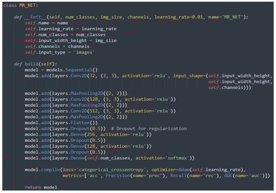 - MR_Net: The network we designed and developed in this paper is composed of 13 layers constituting a convolutional block and a classification block. The convolutional block is composed of three Conv2D layers, alternating with MaxPooling2D layers, with the aim of reducing the dimensions of the images, maintaining their main characteristics. The classification block consists of three Dense layers, alternating with Dropout layers, used to improve the generalization of the network. The ReLU` was chosen as the activation function for the intermediate layers and the Softmax for the last layer linked to the classification. Finally, since it was a multiclass classification problem, categorical cross-entropy was used for the loss of function. Figure 2 shows the code snippet related to the MR_Net Python implementation, with the aim to understand in details the network structure and layers.