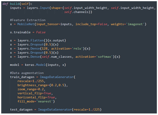 As an example, in Figure 3, we show the code we developed for the fine-tuning of the MobileNet network. Similar code snippets were developed for the fine-tuning of the VGG-16 and VGG-19 networks.
