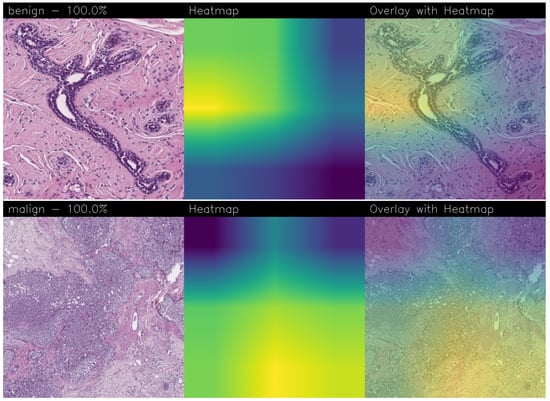 Accurate histopathological diagnosis is crucial for BC as patient numbers surge and pathologist resources dwindle []. We believe that our study significantly impacts the early diagnosis and identification of breast cancer tumors and their subtypes, especially atypical and malignant tumors, thus improving patient outcomes and reducing patient mortality rates. Although the proposed model did not outperform state-of-the-art models in terms of BC detection, it did in terms of explainability, as the heatmaps generated using Grad-CAM revealed a proper detection of the presence of benign, atypical, and malignant tumors. Both our networks (Standard_CNN and MR_Net) based their decision on the geometry of the structures and the number and shape of the cells. However, MR_NET managed to obtain more defined contours for the areas of interest, despite presenting a slightly lower level of confidence. Neither already existing models nor the fine-tuned ones seemed to reach these results for the Grad-CAM heatmaps. It is clear that these models did not evaluate the correct areas of the images, thus partially invalidating their results. Integrating deep learning into routine pathology practice stands to improve diagnostic accuracy, thereby contributing to reducing avoidable errors. As future work, we will explore the possibility of considering other models, for instance, related to object detection, to understand whether it is possible to improve the performance obtained in terms of BC localization. Moreover, we are working to provide numerical values of the coincidence of the regions obtained by Grad-CAM with the image areas for decision-making, with the aim to compute a kind of metric for the evaluation of the qualitative analysis.