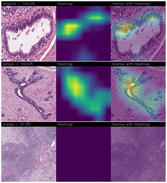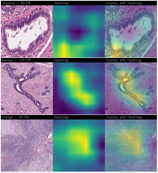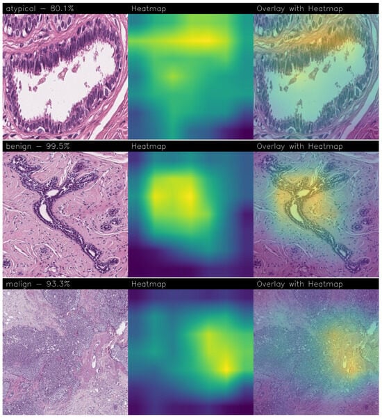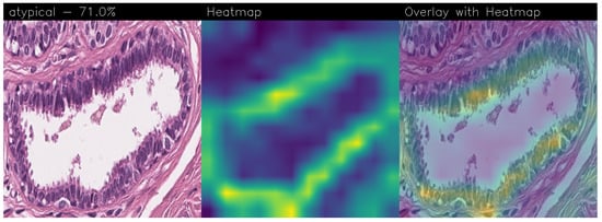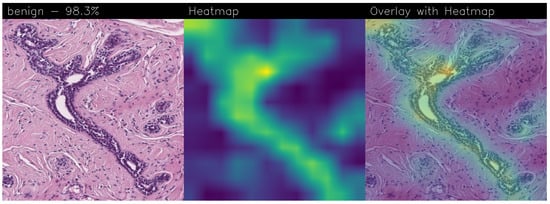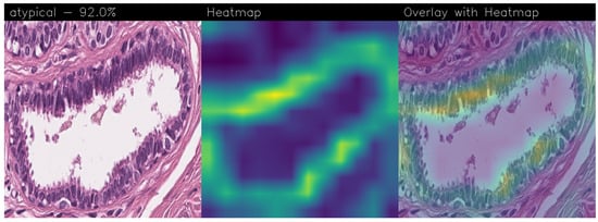 Di Giammarco et al. [] proposed a robust deep learning method for cervical cancer screening, adapted for breast cancer studies. The method focused on interpretability through Grad-CAM visualizations, providing insights into the model’s decision-making process for histopathological images.