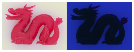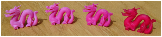 - Print a 3D object using the material of interest. Select an object, preferably with regions of different material thicknesses. The triangle mesh describing the object will be used both for printing and for creating the digital twin of the printed object that will be used for the photo-render comparison. We used a lowpoly version of the Stanford dragon [36,37] prepared for 3D printing (a non-trivial 3D geometry with both thin and thick regions).