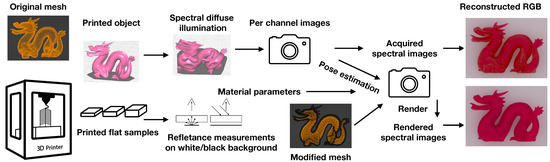 An overview of our validation procedure is in Figure 4. Our approach relies on 3D printing and requires a method for the spectral acquisition of the optical properties of the printing material of interest. The method presented in Section 4 is an option. The optical properties could also be computed based on a material characterization [33,34] or through the adjustment of reference properties [35]. Once optical properties are available, our procedure consists of the following steps: