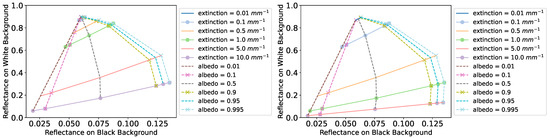 A challenge for the method of Iser et al. [4] is that parameter estimation requires the generation of several appearance maps as they change for different sample thicknesses and each point in an appearance map requires a pair of simulations with white and black backgrounds. Other parameters that require recomputing the appearance maps include the background reflectance and surface roughness. Since the appearance maps shift with these parameters, the number of simulations needed quickly grows, making the method quite impractical compared with our analytic model. We decided to use measured background reflectance values at a wavelength of 650 nm. The advantage of using Monte Carlo simulation is that it includes multiple scattering. Our model has continuous functions and is more easily used in an optimizer, but if we try to plot its predicted reflectances on black and white background as an appearance map, the predicted values stop matching the Monte Carlo simulation well when the scattering coefficient increases above for a sample of 0.1 mm thickness. Figure 6 shows examples of appearance map prediction based on our model. It is clearly limited by the single-scattering assumption.