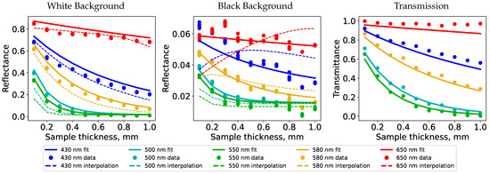 We set up a nonlinear least squares optimizer to fit the curves described by Equations (22), (25) and (26) to the obtained reflectance and transmittance data. For the background reflectances, we used measured values of backgrounds instead of assuming them to be 1 (white) and 0 (black). We set up the fitting procedure in two steps. As the first step, the surface reflectance parameter was fitted (constant across the spectrum) by minimizing the sum of the residuals when fitting the absorption and scattering coefficient for five wavelengths (430, 500, 550, 580, and 650 nm). With fixed, we fitted the absorption and scattering coefficients, and , respectively, for the whole spectrum, each wavelength independently. This was achieved using for the optical thickness, where t is the sample thickness, for the extinction coefficient, and for the scattering albedo. As mentioned in Section 4, a wavelength-dependent correction factor can be introduced in our model and fitting to help the model fit reflectance and transmittance using samples exhibiting multiple scattering. We did not use this correction in the fits reported in Section 7.