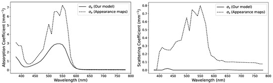Estimated spectral absorption coefficients (, left) and scattering coefficients (, right) of the Red Vero material when using our model (solid curves) and appearance maps averaged over 10 values for sample thicknesses of 0.1 to 1 mm (dashed curves).