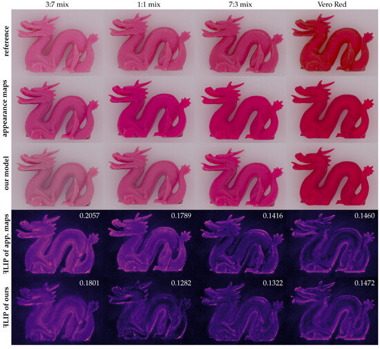 The dragon objects from Figure 3 were PolyJet 3D printed using different mixtures of the materials Vero Red and Vero Pure White. The references are diffusely illuminated multispectral images converted to sRGB. We show images rendered based on our radiometric validation procedure (Section 5) using optical properties estimated with appearance maps [4] and our model (Section 4), and we include the FLIP error maps [8] and average FLIP errors of the rendered images (an average of less than 0.15 seems a reasonably good prediction of the appearance of the printed object).